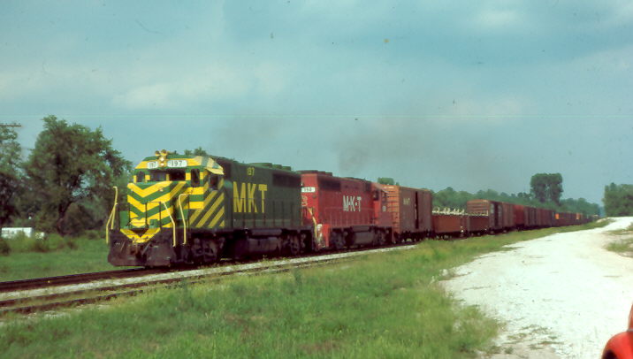 Seen here on a warm August 24, 1974 is westbound MKT train #102 at Tebbets, MO. Bound for Sedalia, and ultimately Parsons, and Dallas, the freight is being led by Katy GP40 #197, fresh in her "new" green and yellow paint, followed by sister GP40 #198, which was still in the old red and white color scheme. Today, the tracks are gone, and in its place is the Katy Trail. As a result, you can still enjoy this beautiful Missouri scenery today, although the best part won't be there! Rick Morgan photo.