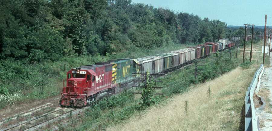 Seen here on the clear summer day of July 17, 1976 is MKT GP-40 #188 heading up a freight at West Alton, MO, just north of St. Louis. Photo by Bill Phillips, Copyright George Elwood.